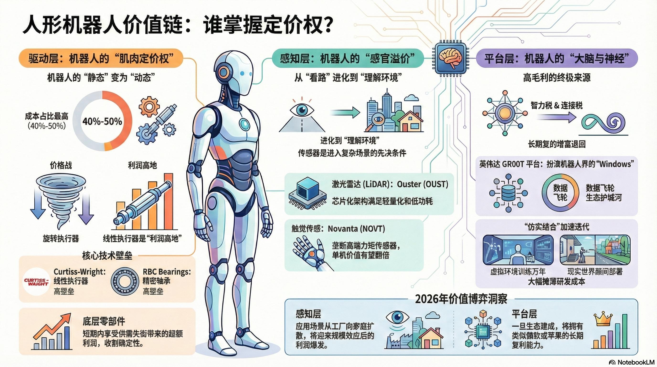 2)机器人生态呈现明显的价值分层:掌握线性执行器与精密轴承的驱动层(如 RBC、CW)正收割确定性溢价;以激光雷达与触觉传感为核心的感知层(如 OUST、NOVT)随场景扩散迎来爆发;而英伟达与特斯拉则通过数据飞轮锁定平台层的长期“增值税”。