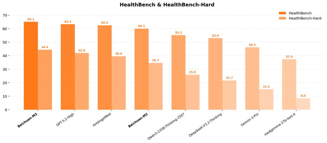 从结果上看,M3依然是一款多个第一的模型。它在HealthBench上登顶,意味着在OpenAI亲自定义的医疗能力标准体系下完成了全面超越;而在更强调复杂临床决策能力的 HealthBench Hard子集中,M3以44.4分夺冠,首次系统性超过GPT-5.2,这一成绩的说服力更强,因为它验证的已不只是回答是否专业,而是模型在高度不确定、高推理难度场景中的稳定性与可靠性。