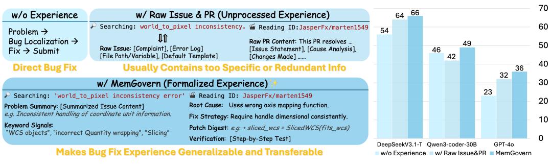 它证明了将GitHub上杂乱的原始Issue与PR经过经验加工后能被视为可检索、可验证、可迁移的“经验记忆”,而非充满噪声的“干扰数据”,是打破智能体封闭世界的限制、解决复杂现实世界Bug的强大范式。