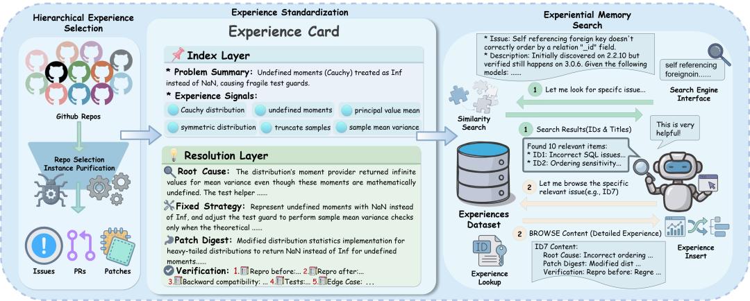 该框架并未采用简单的检索增强(RAG)路径,而是提出了一套完整的“经验精炼”机制,将杂乱的GitHub数据转化为智能体友好的结构化记忆,并结合了Deep Research的思想提出了“Experiential Memory Search”策略,实现了从历史经验中提取可复用修复逻辑的闭环。