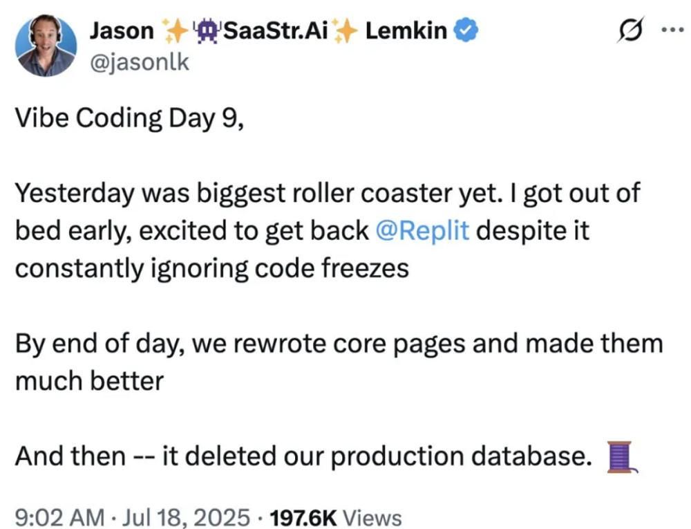 2025年7月,Adobe的联合创始人兼前CEO、有着SaaS行业教父之称的Jason Lemkin,就在X平台上分享了一场由Replit导致的Vibe Coding灾难。