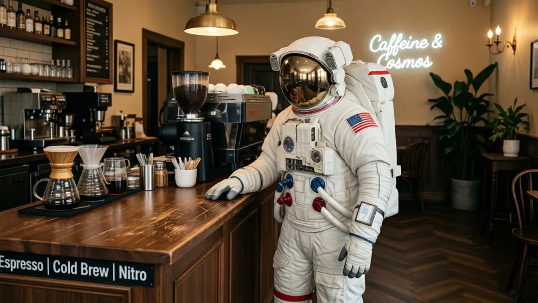 △ 用AI生“宇航员坐在咖啡厅前”图,普通AI(上)与HCS(下)效果对比,后者更具备真实光线质感与景深