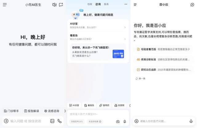 图源 / 字节跳动的“小荷AI医生”(左)、科大讯飞的“晓医”(中)、百川智能的“百小应”(右)