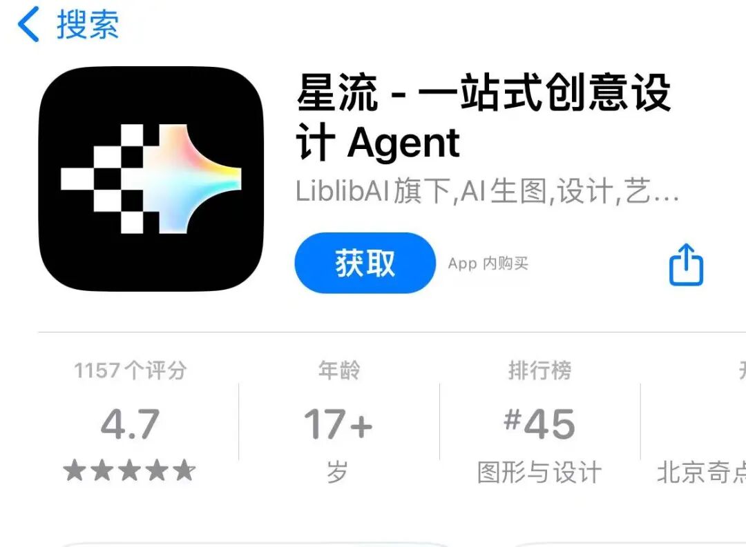 随着国内AI创业团队集体出海,Lovart也试图进行一次逆向的“出口转内销”,推出了国内版“星流Agent”。但现实显得颇为骨感,在缺乏引路人以及海外那种成熟路径依赖的情况下,星流APP在APP store的排位并不理想。截至发稿,星流APP甚至在图形与设计分类也仅排名45位。