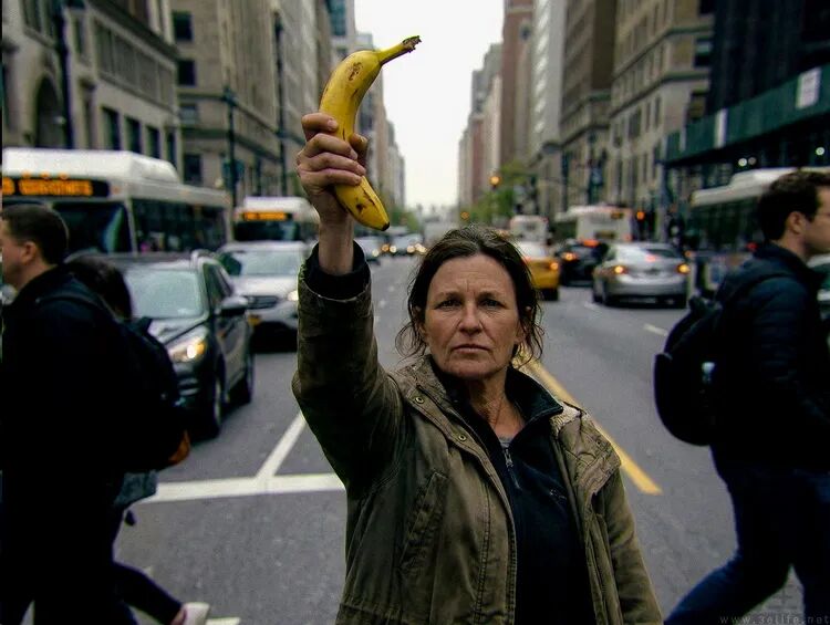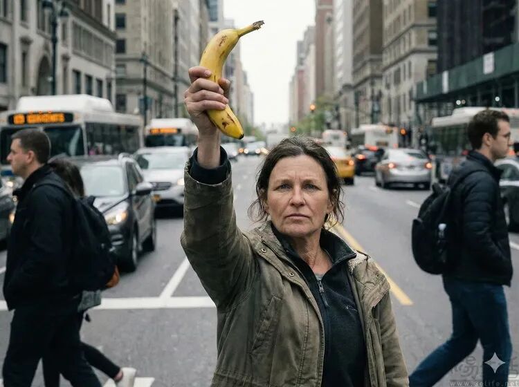 在测试一开始,此次实验的设计者首先选择了谷歌的图像生成AI“Nano Banana Pro”,并用它画了一幅既有现实风格,但具体内容又略带荒诞的图像,即“一位女子手持香蕉指向天空。背景是典型的城市景观,行人漠不关心。”
