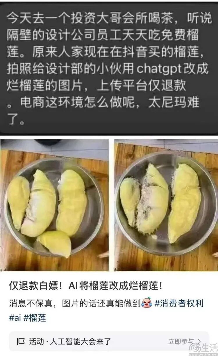 比如,拿“AI P图”将网购的商品照片修改成损坏或腐烂的样式,从而骗取退款的报道,现在就经常可以见到。