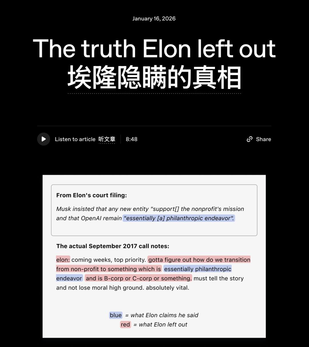 OpenAI并没有坐以待毙,在官网单开一页专门用来反驳马斯克的证词,就很Drama。