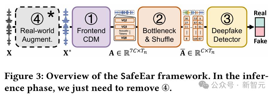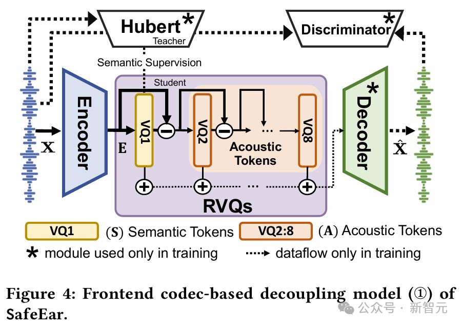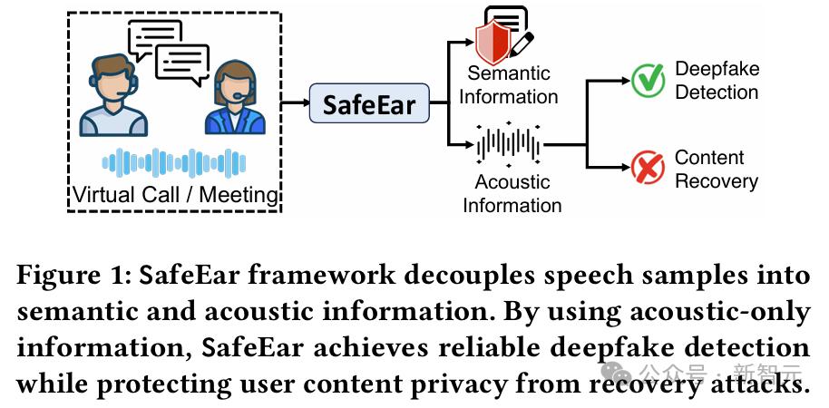 SafeEar的核心思路是,设计基于神经音频编解码器(Neural Audio Codec)的解耦模型,该模型能够将语音的声学信息与语义信息分离,并且仅利用声学信息进行伪造检测,从而实现了内容隐私保护的语音伪造检测。