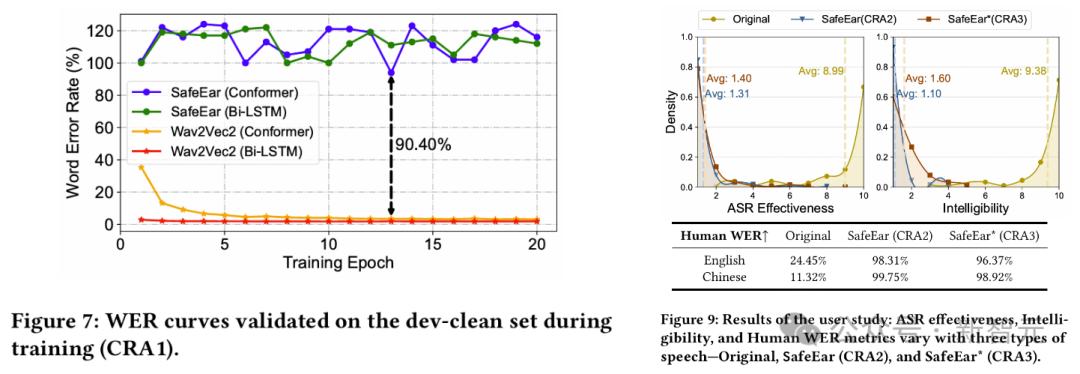 同时,实验还证明攻击者无法基于该声学信息恢复语音内容,基于人耳与机器识别方法的单词错误率(WER)均高于93.93%。