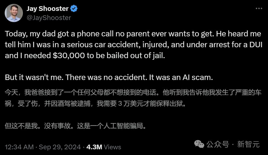 诈骗者利用AI克隆了Shooster声音,然后给他的父亲拨去电话:您孩子因酒驾开车被捕,需3万美元保释出狱。