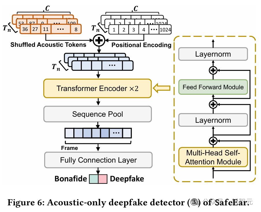 SafeEar框架的伪造音频检测后端设计了一种仅基于声学输入的Transformer-based分类器,采用正弦、余弦函数交替形式对语音信号在时域和频域上进行位置编码。