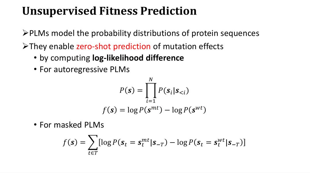 接下来继续讨论 Fitness 预测问题。由于 PLM 可以建模蛋白质序列的概率分布,因此无需标注数据,即可直接用于突变的 Fitness 预测,这种方法被称为零样本预测 (zero-shot prediction) 或无监督预测。
