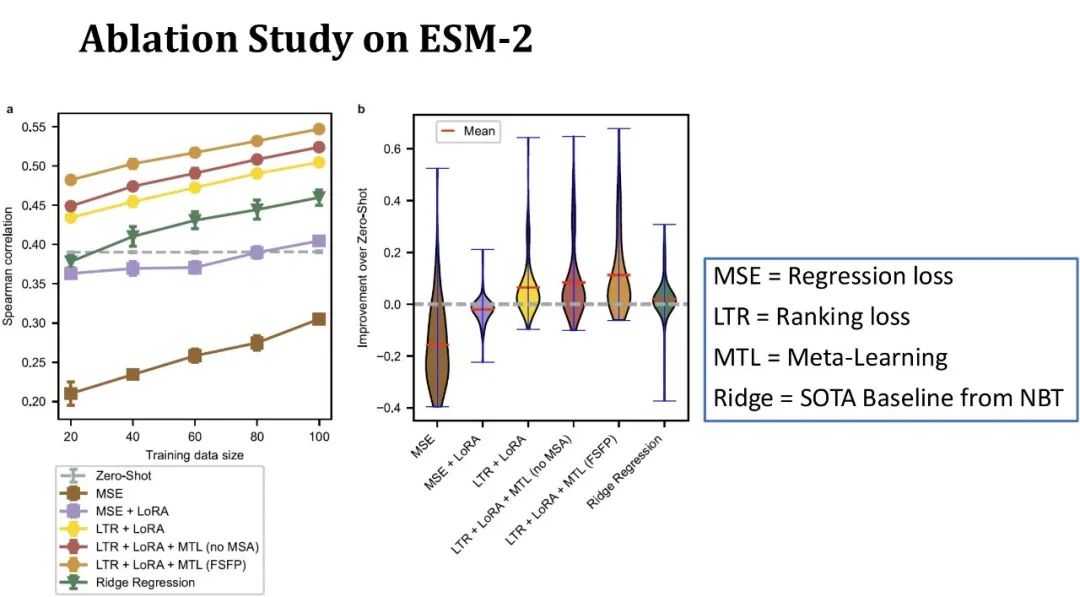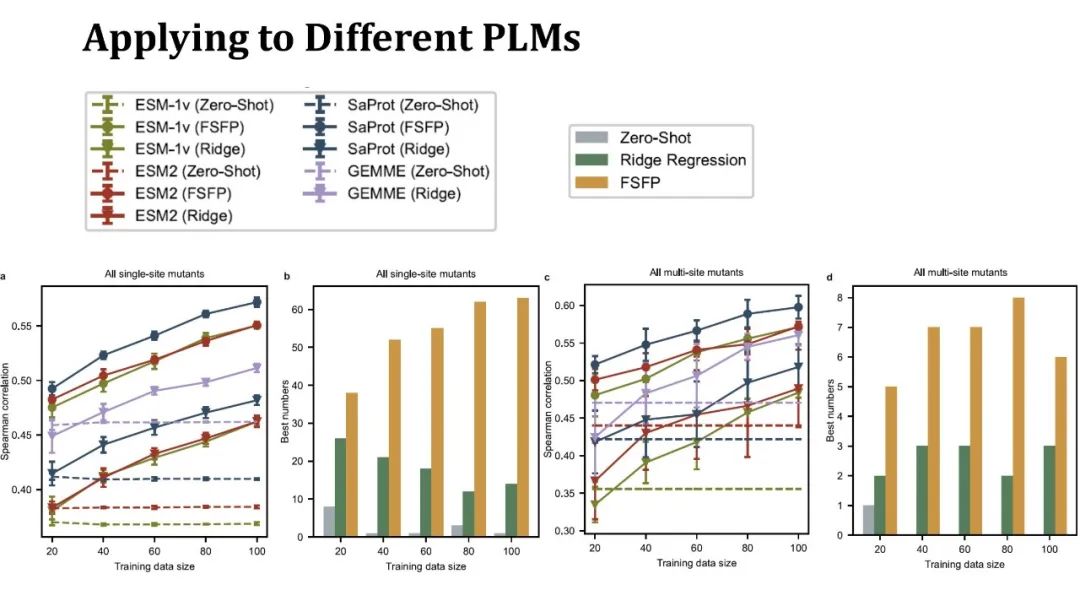 左侧折线图展示了不同训练集大小下,预测单点突变效果的 Spearman得分,同一种颜色代表同一个模型,点的不同形状代表不同的训练方法。上方的圆点表示 FSFP 方法,下方倒三角表示岭回归,虚线表示模型的zero-shot性能。紫色线则代表 GEMME 模型,它不是 PLM,但是岭回归方法用可以和它结合。可以看出,FSFP 方法可以稳定地提升各个 PLM 的性能,而且远好于岭回归和对应模型的 zero-shot。