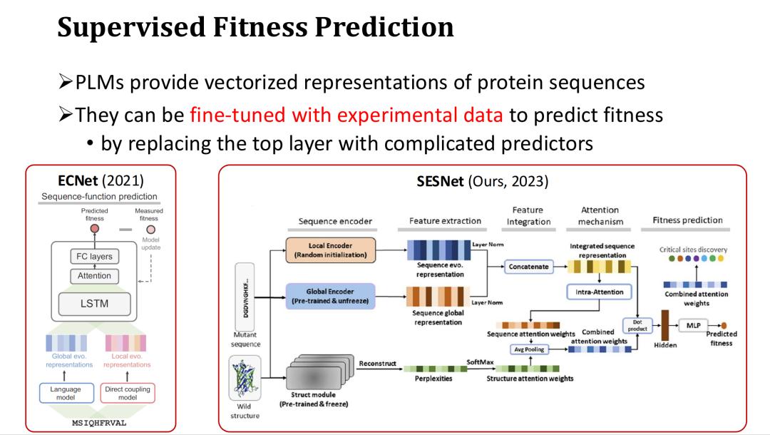 具体做法是在 PLM 的最后一层特征后加上一个用于预测 Fitness 的输出层(如注意力机制或多层感知机 MLP),并使用 Fitness Label 进行全量或者部分训练。例如,ECNet 在大模型特征基础上加入了 MSA 特征,通过 LSTM 进行融合,进行有监督训练。我们课题组去年开发的 SESNet 模型则融合了 ESM-1b 的序列特征、ESM-IF的结构特征,以及 MSA 特征,进行有监督的 Fitness 预测。