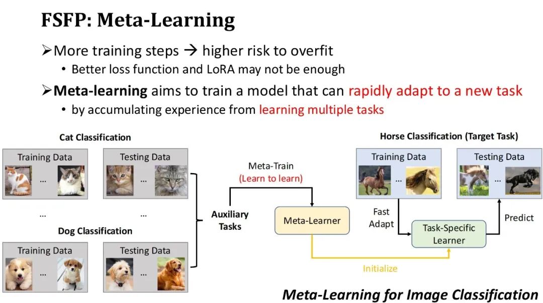 为了避免过拟合,我们不仅使用了更好的损失函数,还通过 LoRA 技术限制了可训练参数量。然而,即便如此,若在小样本训练数据上的训练迭代步数过多,还是存在过拟合的风险。因此,我们希望通过较少的训练迭代步数快速提升模型性能。基于这一需求,我们采用了第三项技术——元学习。元学习的基本思想是,首先让模型在某些辅助任务上积累经验,获得一个初始模型,然后利用该初始模型快速适应新任务。