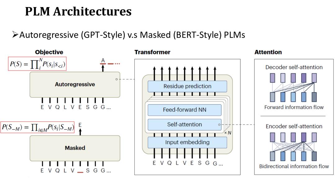 PLM 的架构与自然语言 LM 相似,分为自回归 (Autoregressive) 模型和遮蔽 (Masked) 模型。这两种模型的网络结构都采用 Transformer,由自注意力机制 (Self-attention) 和全连接层组成,主要区别在于预训练目标。