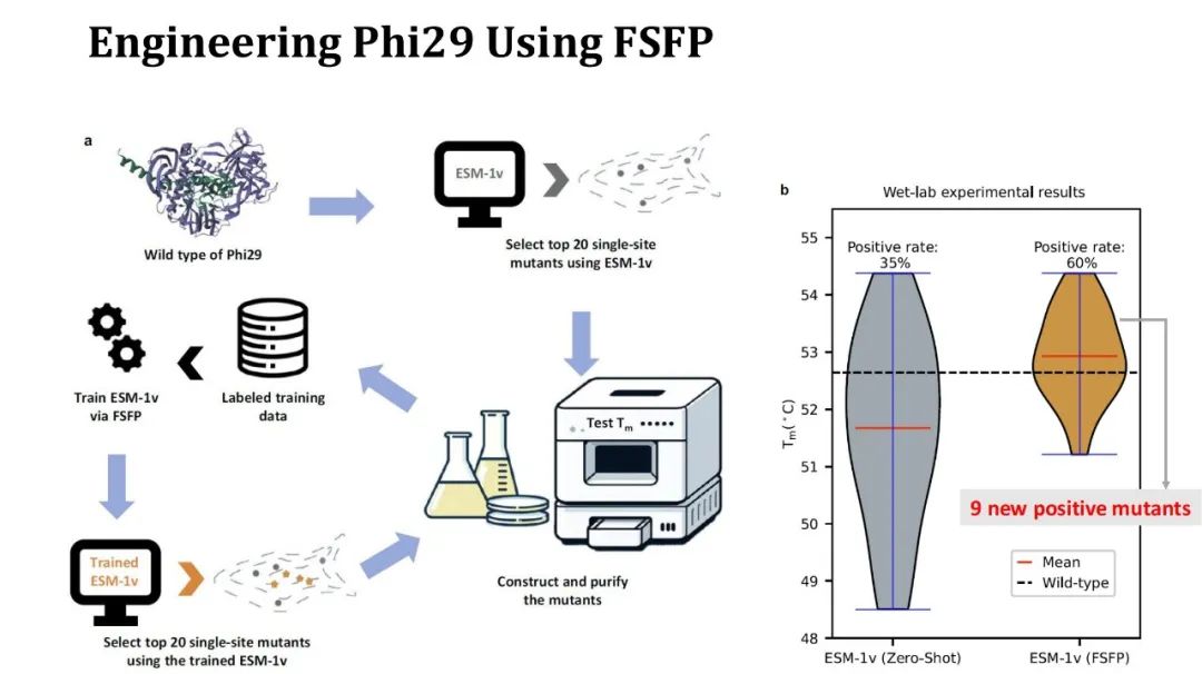 此外,我们还用 FSFP 做了一个蛋白质改造的案例。目标蛋白质为 Phi29,这是一种 DNA 聚合酶,我们希望通过单点突变来改善它的 Tm。