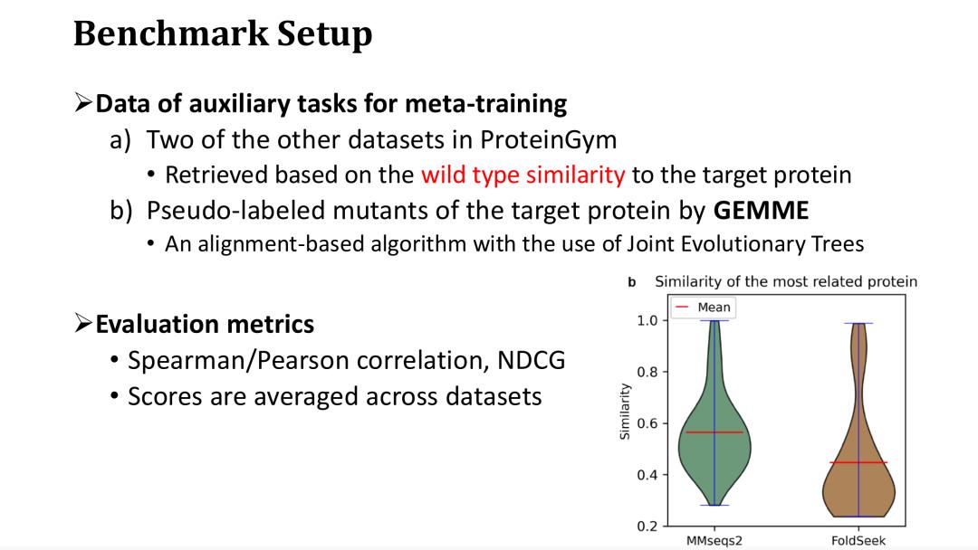 此前提到元学习需要 3 个辅助任务,其中 2 个辅助任务是根据和目标蛋白的相似度从 DMS 数据库里检索出来的。在某一数据集上进行训练时,我们从 ProteinGym 的其余数据集中进行检索,假设它就是数据库。