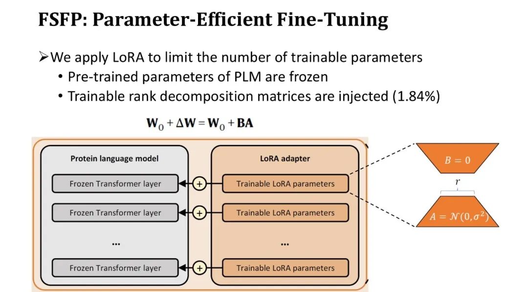 由于 PLM 的参数量通常高达数亿个,用极少的数据进行全量微调必然会导致过拟合。因此,我们引入了第二项技术 LoRA,来限制模型的可训练参数数量。