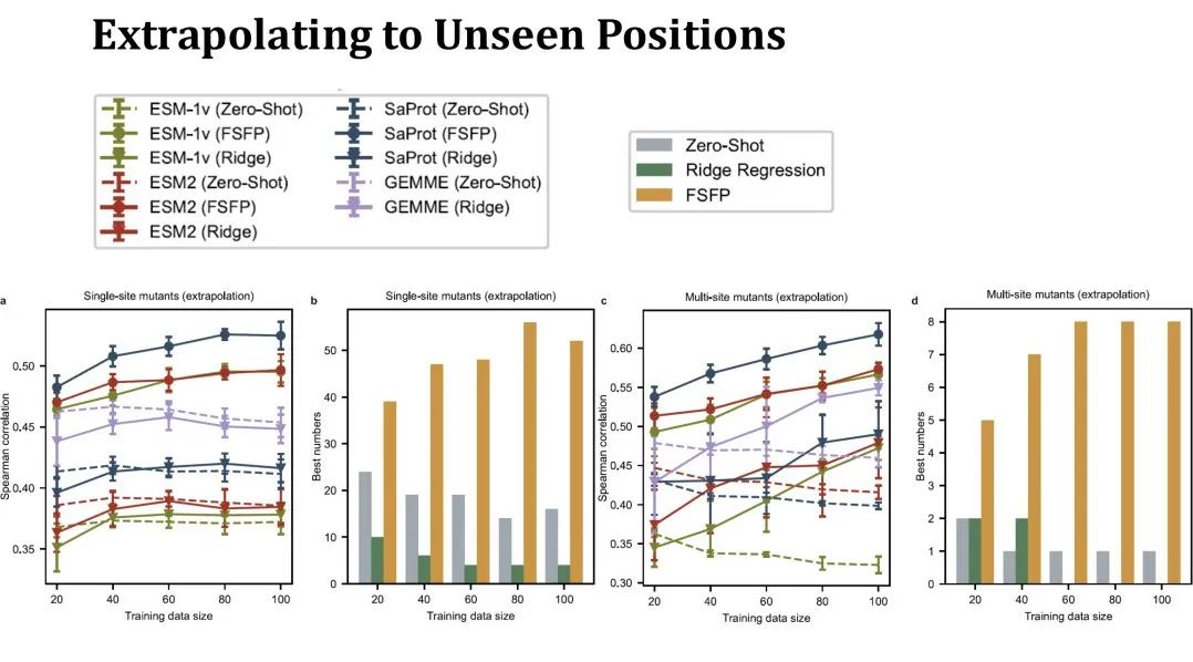 随后,我们评估了 FSFP 的外推性能,即专门评估在训练集里没见过的突变点位上的预测性能。在这种情况下,测试集会比原来小很多,而且测试集会随着训练集变大发生明显变化,所以表里面 zero-shot 性能不再是一条直线了。这种设置比较有挑战性,可以看到左侧单点突变上岭回归的性能几乎没法超过 zero-shot,但是 FSFP 仍然能稳定地提升性能。右侧多点突变的测试结果也同样表明我们的训练方法具有较好的泛化能力。