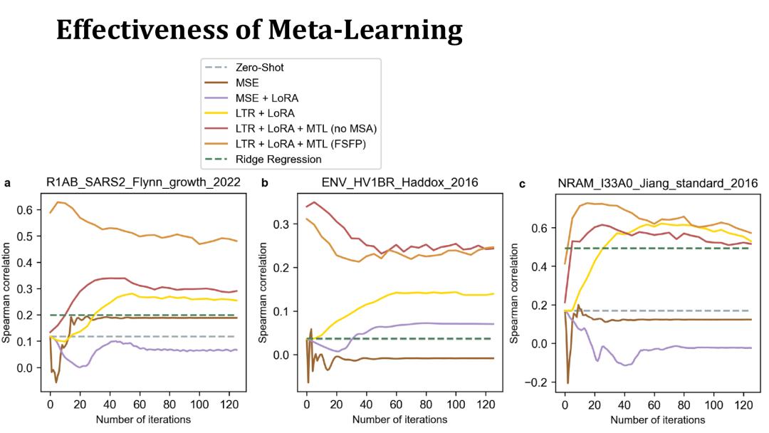 可以看到,经过元学习训练的模型在目标蛋白质上能够更快速地提升性能,且在 20 步以内即可达到较高的分数,有时甚至不加微调的初始模型表现就已经较好。这表明元学习得到了有效的初始模型。而下方基于 MSE 的模型表现较差,且过拟合较快,难以超越 zero-shot 方法。