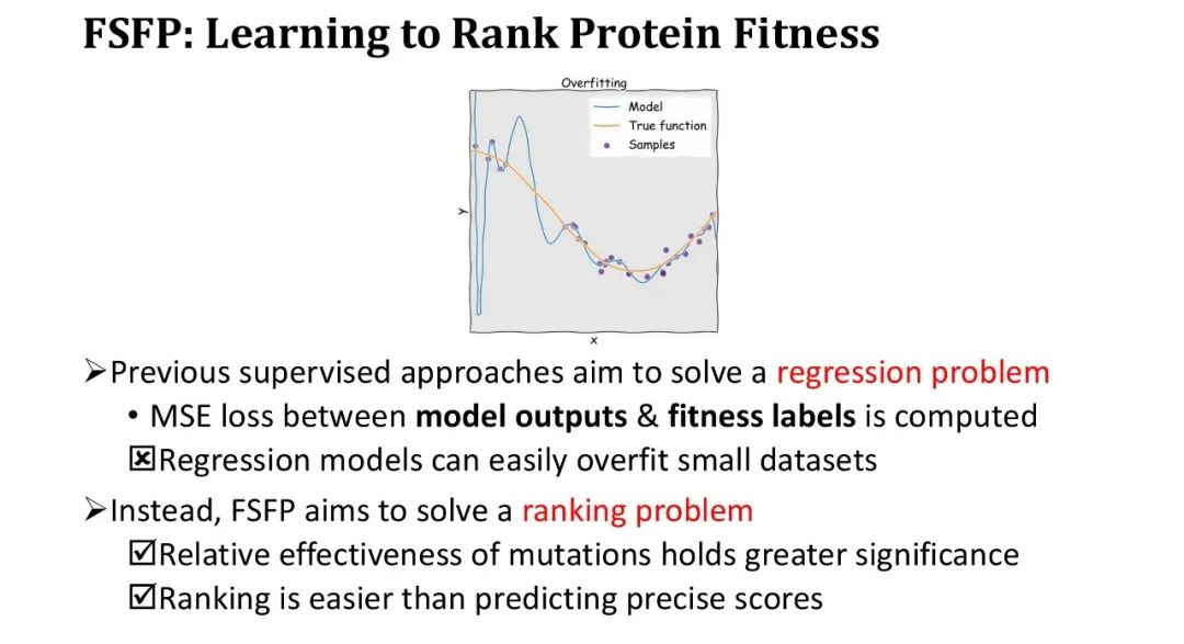 以往的监督学习方法都是将 Fitness 预测视为回归问题,即通过计算模型输出与 Fitness Label 之间的均方误差 (MSE) 来优化模型。然而,在小样本条件下,回归模型非常容易过拟合,训练损失下降极快。因此,我们转变了思路,不去做回归,而是去做排序学习,只要求排序准确,不强求拟合精确数值。