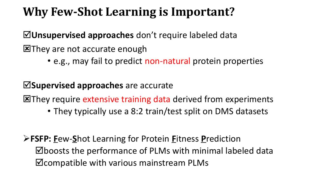 在介绍 FSFP 方法之前,需要先明确小样本学习在 Fitness 预测中的重要性。尽管无监督方法不需要用标注数据来训练,但其 zero-shot 打分的准确性较低。此外,因为基于对数似然比的打分只能反映蛋白质的某些自然规律,它们也难以有效预测蛋白质的非天然属性。