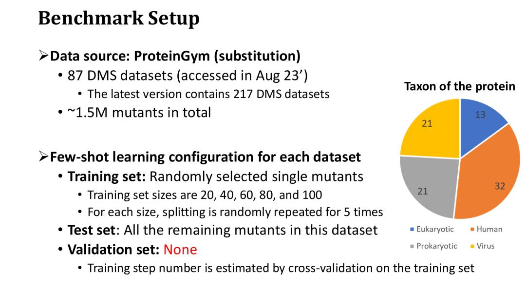 对于每个数据集,我们随机选取 20、40、60、80 和 100 个单点突变作为小样本训练集,其余突变则作为测试集。需要说明的是,我们没有使用额外的验证集来做 early stop,而是在训练集上通过交叉验证来估计训练步数。