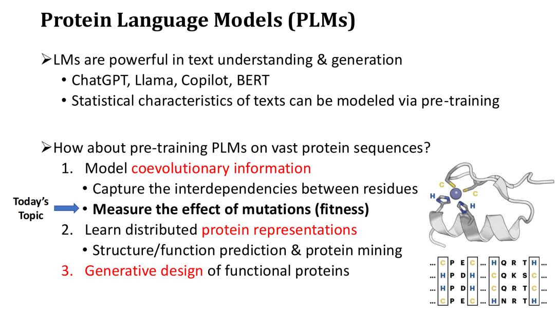 蛋白质语言模型 PLM 主要有 3 类作用。首先,PLM 能建模蛋白质序列的共进化信息,学习残基之间的相互依赖关系和进化约束,就好比自然语言LM能够学习文本的语法一样。PLM 可以用这种能力去估计哪些突变是有害的或者有利的,从而能预测突变的 Fitness。