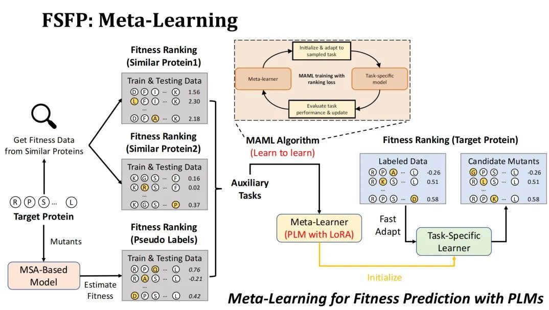 如何将元学习应用到 Fitness 预测的场景?首先我们的目标任务是对目标蛋白质的突变做 Fitness 排序,而要训练的模型是采用了 LoRA 技术的 PLM。
