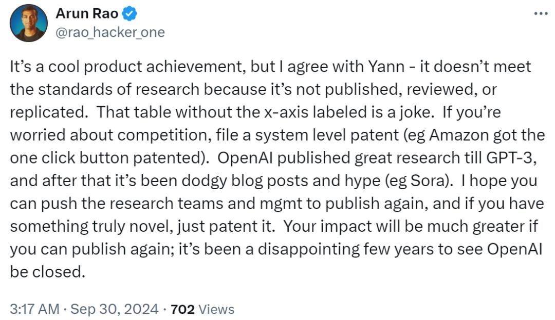 还有网友表示「虽然这是一项很酷的研究,但我同意 Yann 的观点 —— 不符合研究标准,因为 OpenAI 没有发表论文、进行同行评审或研究的可复现性。OpenAI 在 GPT-3 之前发表了很棒的研究,之后就是让人怀疑的博客文章和炒作(例如 Sora)。我希望 OpenAI 能推动研究团队和管理层再次发表文章,如果有真正新颖的东西,就申请专利。如果 OpenAI 能发表文章,那么其影响力会更大;这几年 OpenAI 的闭源真是令人失望。」