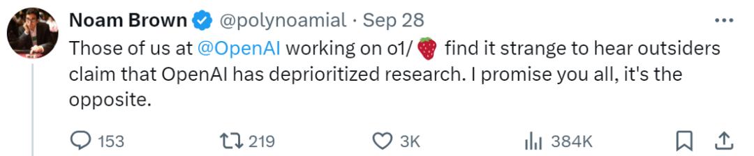 这不,面对广大网友的吐槽,OpenAI 显然是知道的。就在前两天 Noam 发了一条消息:「我们这些参与 o1 的人听到,外界声称 OpenAI 降低了研究的优先级,听到这些消息我们感觉很奇怪。我向大家保证,事实恰恰相反。」