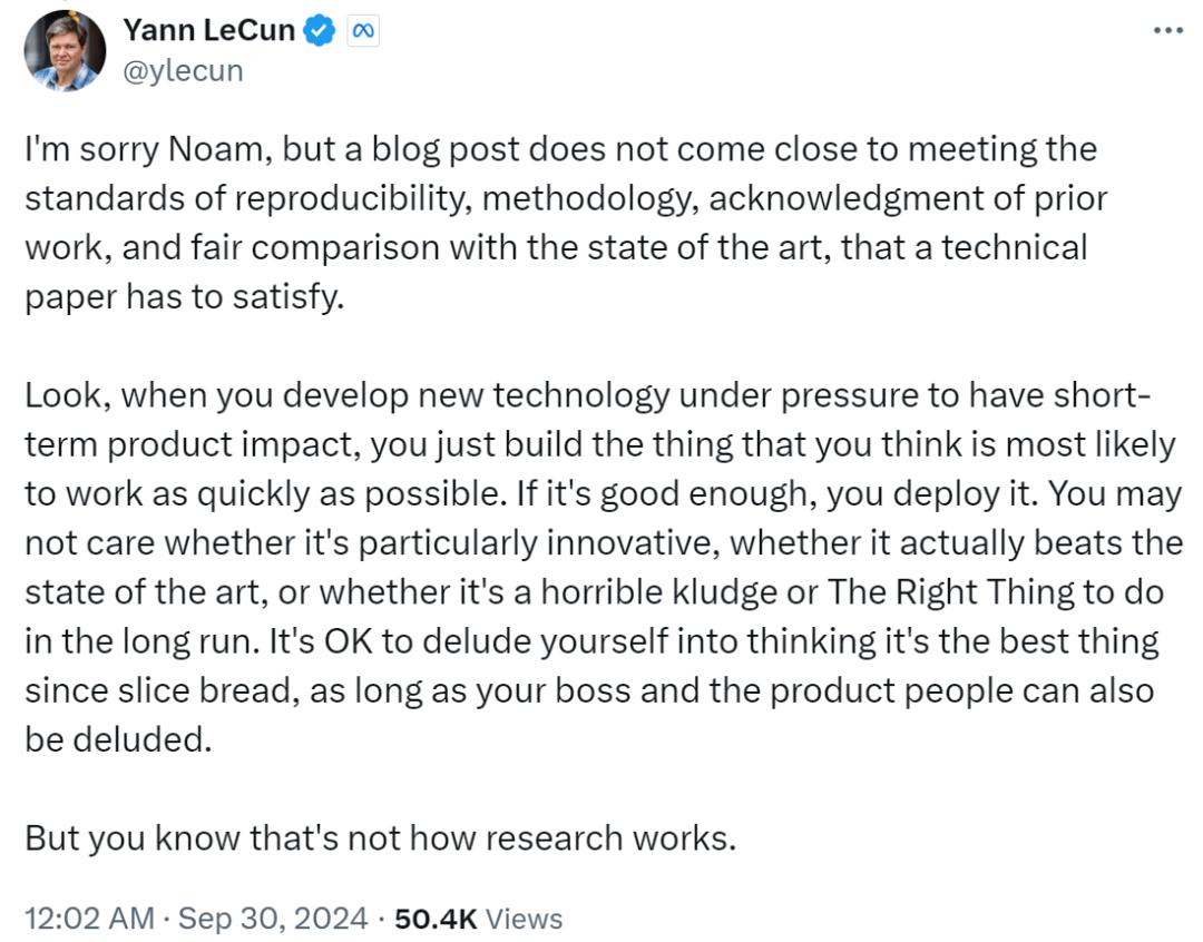 对于这一说法,显然 LeCun 很不满意:「我很抱歉 Noam,但博客文章与技术论文相比,远远达不到可复现性、方法论以及与最新技术的公正比较等标准。当你们在压力下开发新技术以产生短期产品影响时,你们只需尽快构建你认为最有可能发挥作用的东西。如果它足够好,你就部署它。你们可能不在乎它是否真的具有新奇的创新,是否真的超越了最先进的技术,或者它是否是一个糟糕的临时解决方案,或者从长远来看是否是正确的选择。你们可以自欺欺人地认为这是自切片面包以来最好的东西,只要你的老板和产品人员也能被欺骗。但你知道研究不是这样的。」