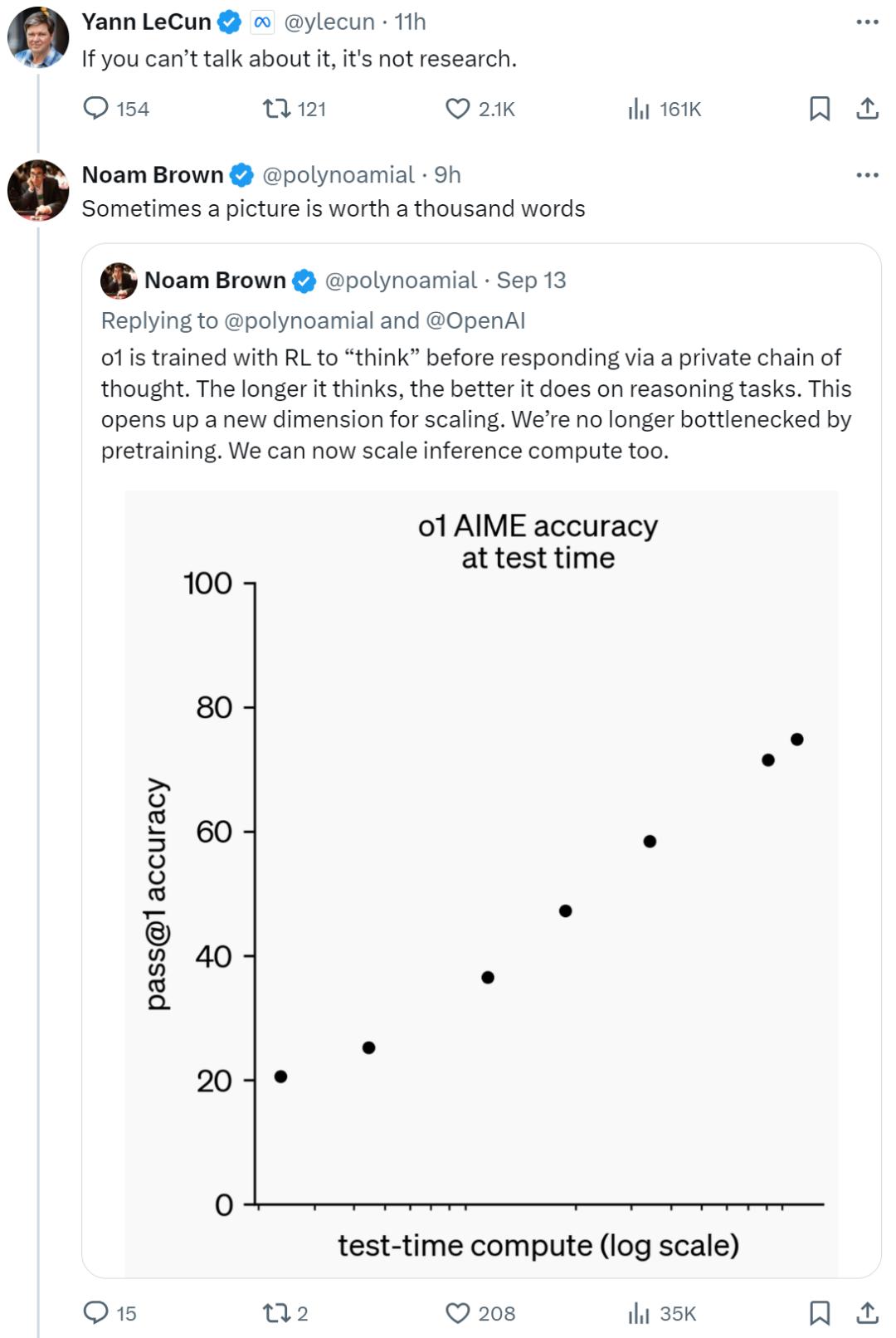 Noam Brown 显然对 LeCun 的回答不是很满意,回击表示:(无需谈论,)有时一幅图胜过千言万语。在 Noam Brown 引用的这张图里,上面还配了一段文字「o1 经过 RL 训练,在通过私有思维链做出反应之前会先进行思考。思考的时间越长,它在推理任务上的表现就越好。这为扩展开辟了一个新的维度。我们不再受预训练的瓶颈限制。我们现在也可以扩展推理计算了。」