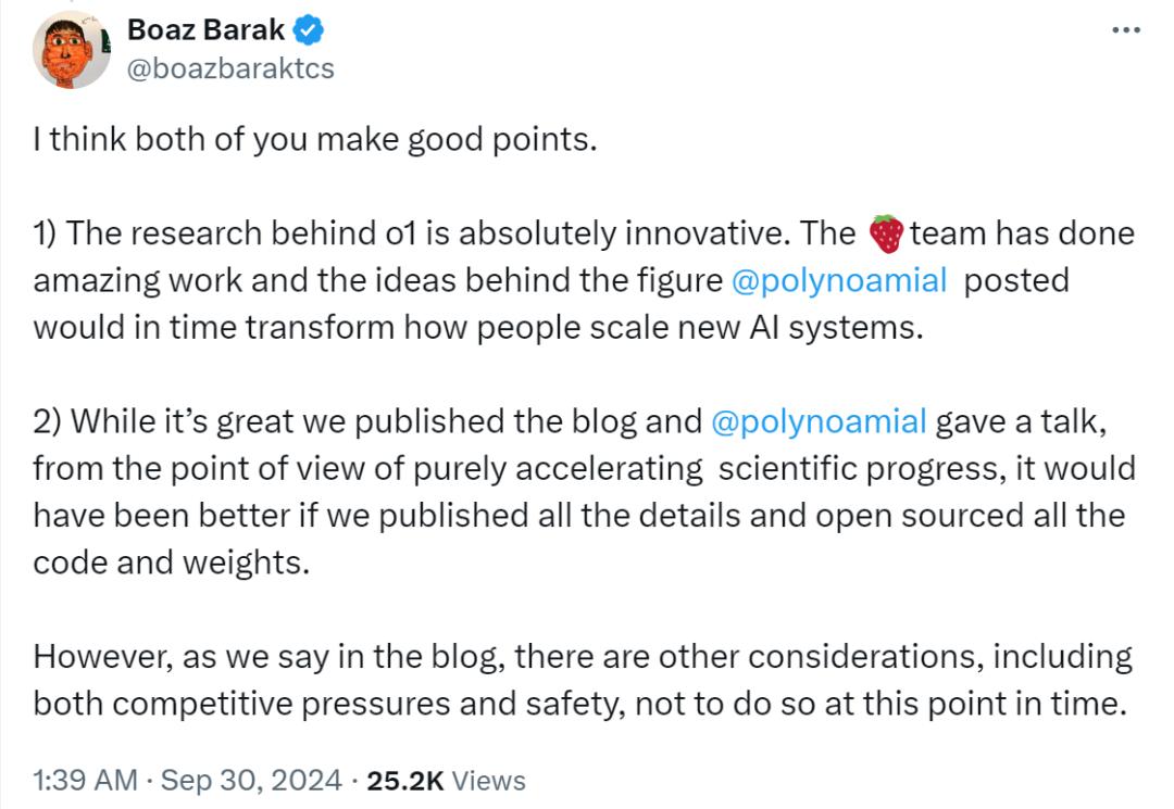 随后,哈佛大学计算机科学教授 Boaz Barak(资料显示,从 2024 年 1 月开始,Barak 离开哈佛大学前往 OpenAI 工作一年)表示:「我认为你们俩的观点都很好。o1 背后的研究绝对具有创新性,草莓团队已经完成了惊人的工作和想法,OpenAI 正在改变人们扩展新人工智能系统的方式。