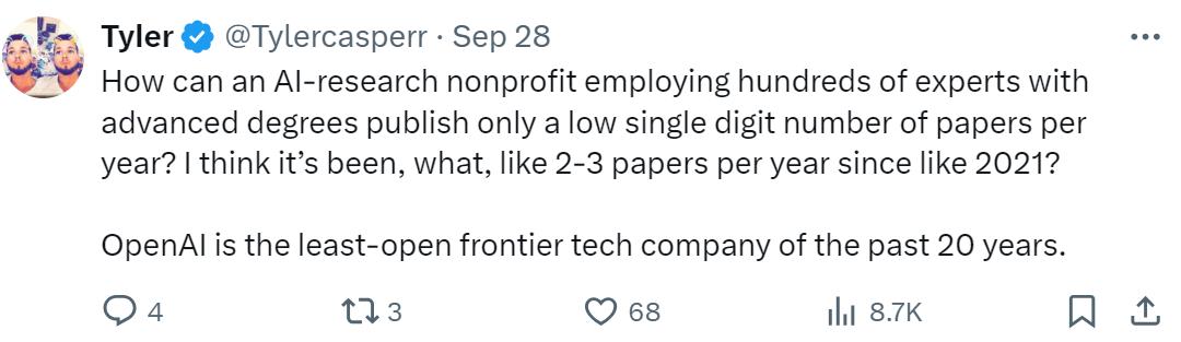 「对于一家拥有数百名高级专家的非营利组织怎么可能每年只发表很少的论文?我认为自 2021 年以来,OpenAI 每年只有 2-3 篇论文?OpenAI 是过去 20 年来最不开放的前沿科技公司。」