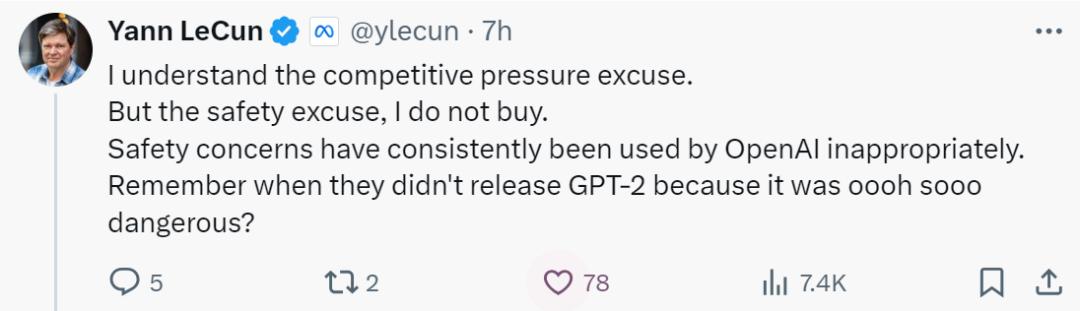 对此,LeCun 认为 OpenAI 不公布技术细节,出于竞争压力的考量还是可信的,但他绝不相信 OpenAI 是为了安全。
