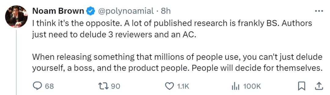 Noam 反驳道「我认为恰恰相反。坦白说,很多已经发表的研究说的都是废话,作者只需要欺骗 3 位审稿人和一位 AC。但当你发布一个数百万人使用的东西时,你不能只是发布欺骗自己、老板和产品人员的产品,用户会有自己的决定。」