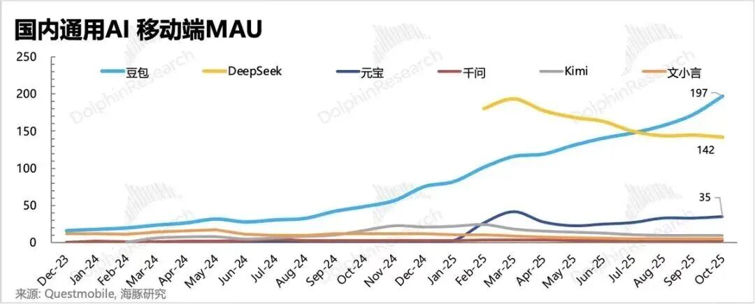 那么,腾讯身处何地?根据QuestMobile数据,截至2025年3月初,腾讯旗下AI应用“腾讯元宝”的日活跃用户约为200万至300万,而同期“豆包”的日活已逼近3000万。至2025年8月,“腾讯元宝”月活用户约为275万,在综合类AI原生App中只排名第八。