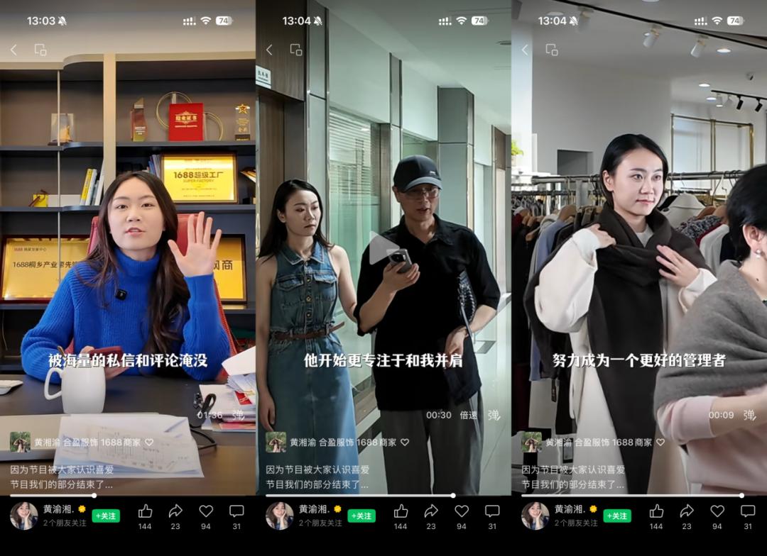 黄渝湘家里的工厂,是位于桐乡的合盈服饰,主营业务羊绒、羊毛大衣、毛衣、打底等服装,去年单羊绒大衣一项,就在1688上卖了1000万。
