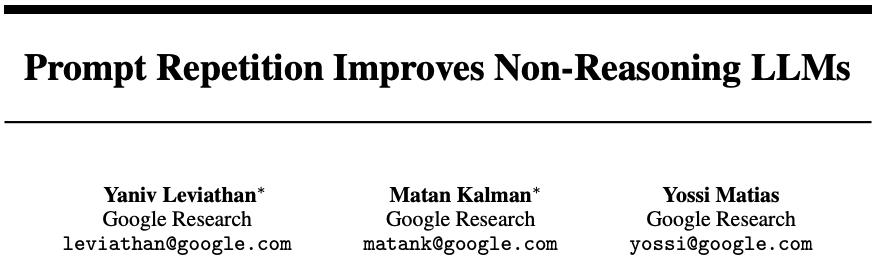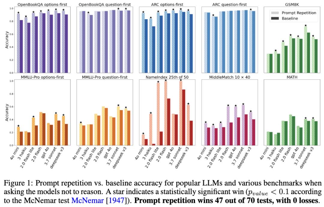 在这篇题为《Prompt Repetition Improves Non-Reasoning LLMs》论文中,研究人员用数据告诉我们: