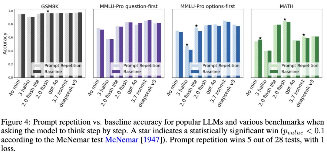 在要求模型逐步思考时,主流LLMs在各类基准测试中使用提示重复与基线方法的准确率对比。提示重复在28次测试中赢了5次,输了1次。