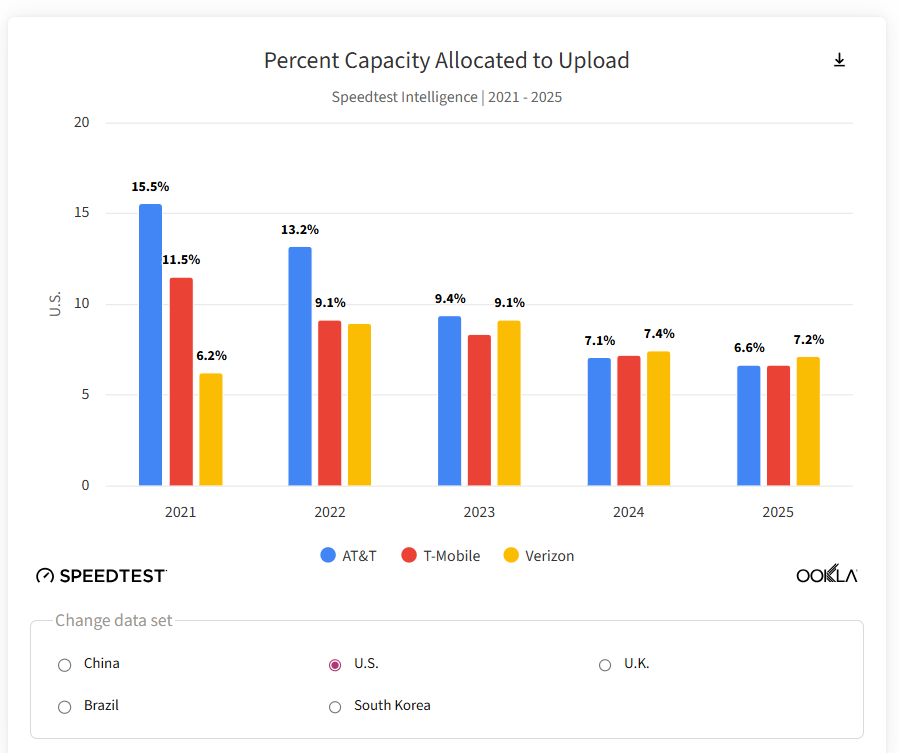 Ookla指出,这表明分配策略更多是由本地市场竞争、用户使用习惯(如中国的直播文化)、以及网络部署战略所驱动的。