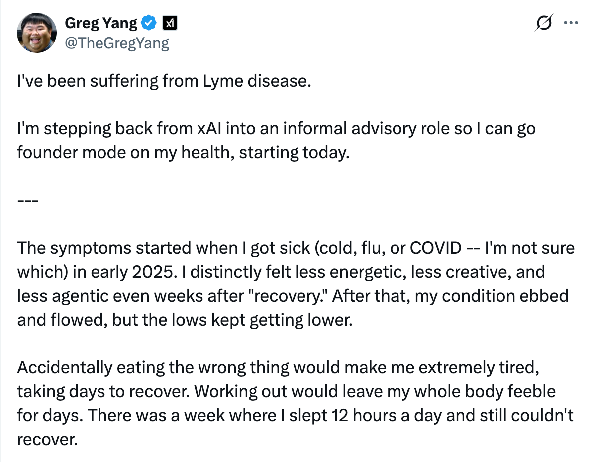 “我很可能很久以前就感染了莱姆病,但直到我在创建xAI的过程中把自己逼得太狠、免疫系统被削弱后,症状才变得明显。”杨格表示。