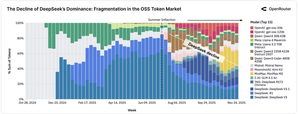 大模型调用平台OpenRouter的统计显示,Kimi K2系列模型的调用量在发布后占据了一定的市场份额。