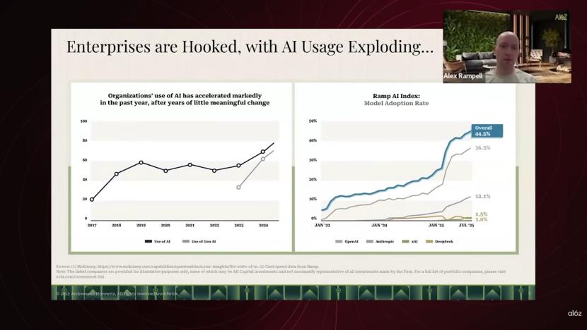 两年前,ChatGPT刚发布时,大家觉得它像个能写剧本的新奇玩具。但现在,它已经渗透进企业,实实在在地为人们节省时间和金钱。以企业支出管理公司Ramp为例,我们可以看到具有前瞻性的公司(不仅仅是初创公司,也包括拥有数千员工的传统企业)正在积极采用AI技术。这不仅是曲线的平稳增长,而是一个剧烈的拐点。