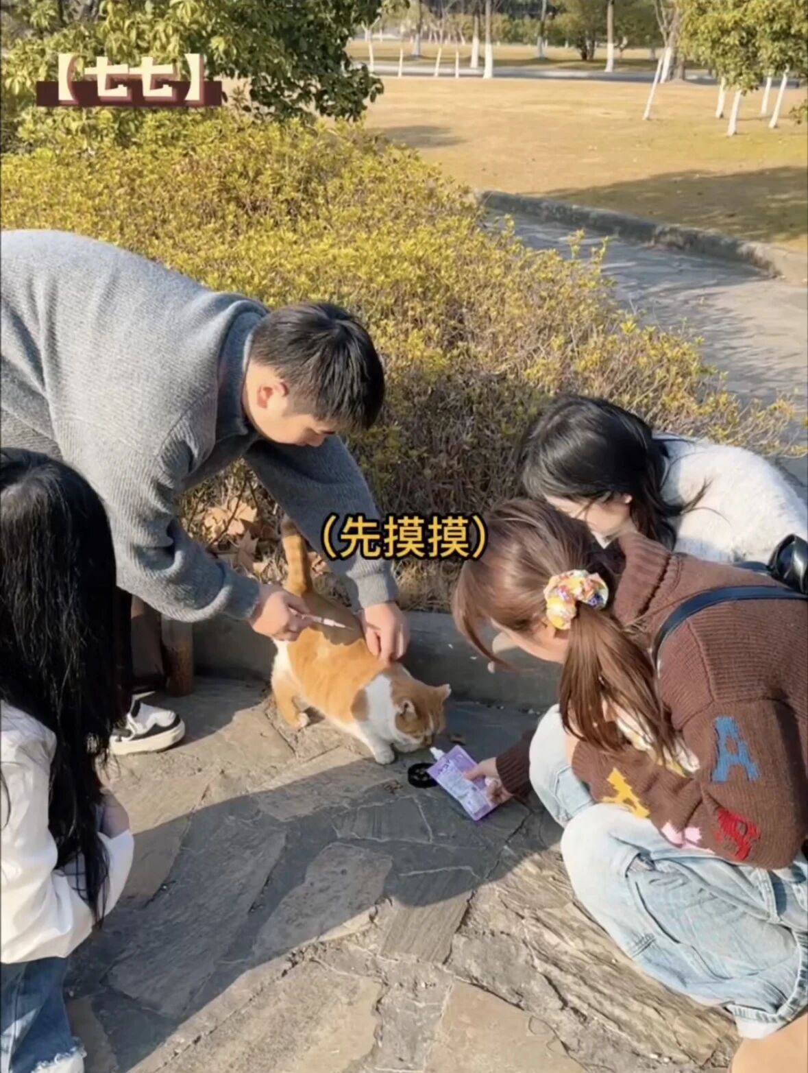 同学们给游子介绍校园里的猫咪