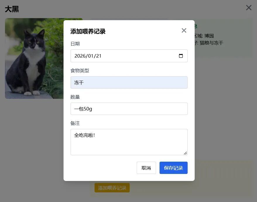 照顾猫咪,从此不再是协会志愿者的“专属任务”,而成了每个路过者都能轻松参与的“公共事务”。轻轻一点,就能为校园“顶流”大黑添上一笔喂养记录,随手一翻,它的健康状况和活动轨迹便清晰可见。
