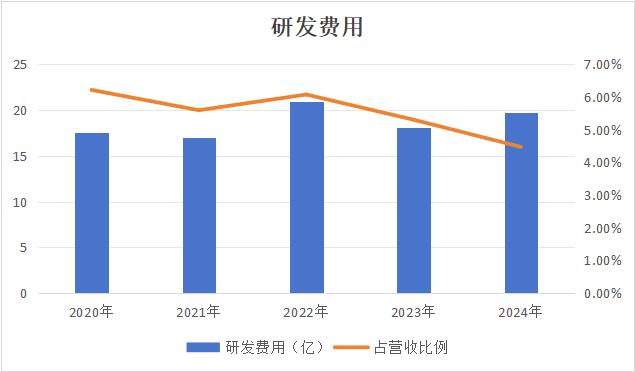 在拓展新业务之时,公司研发费用从 2020 年的 17.49 亿元波动上升至 2024 年的 19.75 亿元,趋势维持向上。