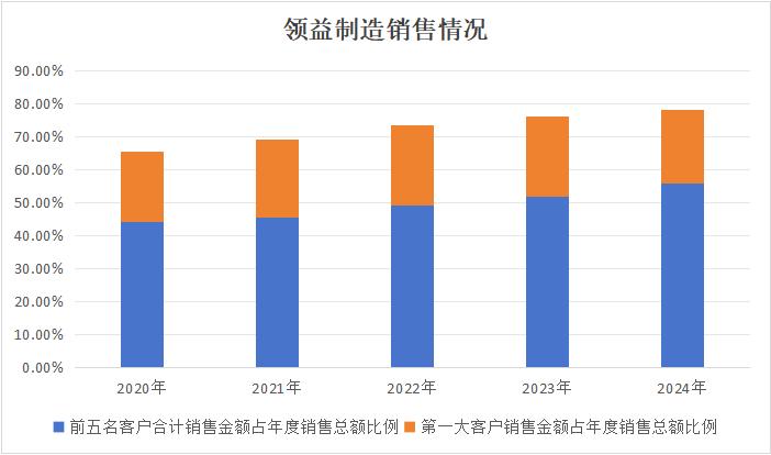 从结构上看,公司客户集中度在过去五年持续上升,前五大客户销售占比由 2020 年的 44.26% 提高至 2024 年的 56.04%。不过,第一大客户占比相对稳定,基本维持在 21%—24.5% 区间。